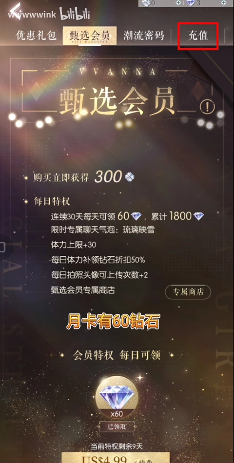 2、点击充值,选择要充值的金额;