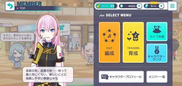 如图所示,游戏的编成界面用于编辑队伍,玩家可通过调整自己的队伍配置,改变游戏过程中获得的分数以及活动pt的获取量。育成界面能够对抽到的角色进行升级操作,右侧的衣装系统则支持更换角色在游戏内3DMV场景中的服装。界面上类似徽章的功能是好感度系统,玩家可以通过界面内的角色对话、购买表情与衣装、抽取卡牌、参与游戏等多种方式,提升角色的好感度并领取相应奖励。