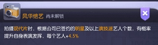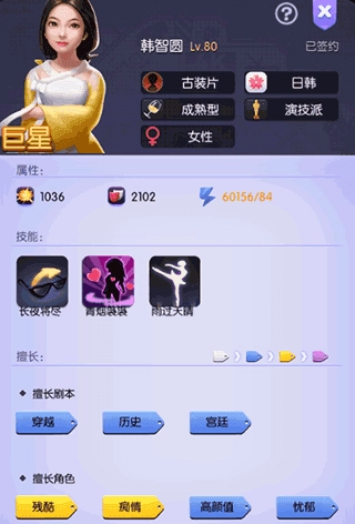身为可在“钻石星探”中抽到的巨星,其获取难度相对较低。该艺人擅长的角色与剧本类型较为小众,通常在现代与古装题材上的适配度会更高一些。