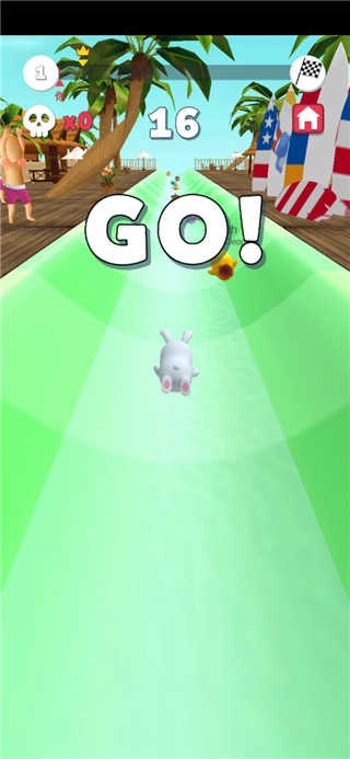 控制角色在赛道里穿梭,躲开障碍物,全力向前冲刺,争夺领先名次