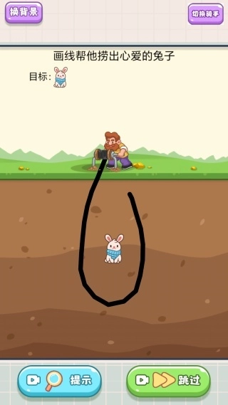 3、按照目标兔子的轮廓,使用画线工具沿着兔子的外围画出闭合的U形线条,要保证线条把兔子区域完全包裹住,并且避开周围的障碍,这样操作完成后就能成功救出兔子了。