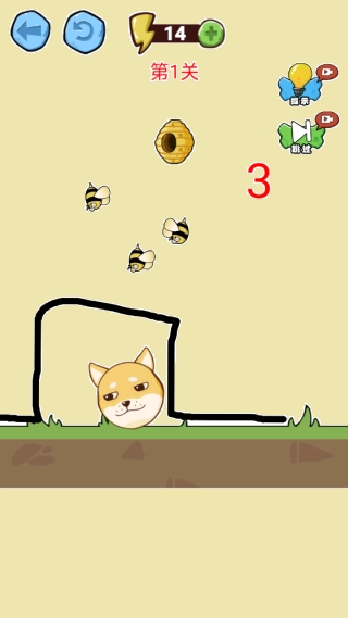 3.当你画完线后,蜜蜂会从蜂巢里飞出来攻击狗头,你得撑过倒计时,这样才算成功。