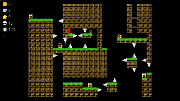 3.你得用枪去射击存档点!游戏界面上方会有自动统计的两项数据:一项是每当你操控kid撞到尖刺死亡,或是成功吃到苹果时,对应的数字就会增加,你要尽量让这个分数变得更高;另一项则是记录你游玩这款游戏总共花费的时间。