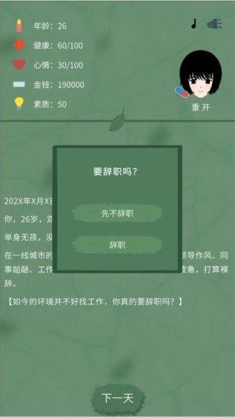 5、这款游戏能让玩家体验裸辞后的生活,从而帮助他们思考自己是否真的适合放弃当前的工作。