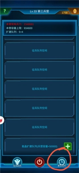 三、兵营的右下角设有两个功能按钮:其一可消耗晶体延长生产线的造兵时长,最长能增至2.5小时;其二则需通过氪金解锁,用于增加生产线的数量。只有当生产线数量充足且单条生产线的造兵时间足够长时,才能实现兵力的大量储备。