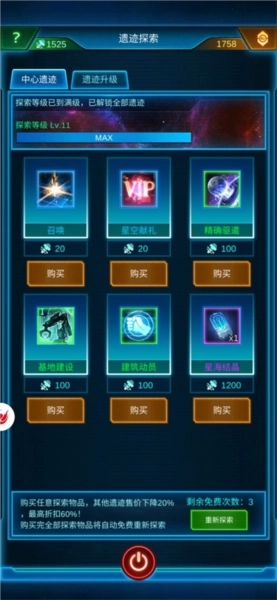 五、每日有5次免费刷新星海奇观的机会。奇观内包含中心遗迹与黑洞遗迹两大区域:在中心遗迹处,你可以消耗模组来兑换对应的技能以及“星海结晶”道具,与此同时,这一操作还能推动黑洞遗迹的进度条;当进度条累积满额后,黑洞遗迹会自动解锁,此时你能免费体验一次;之后若想获取黑洞遗迹的技能,则需要通过付费方式进行随机抽取(建议手头宽裕的玩家尝试)。