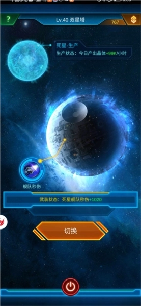 十二、双星塔爆炸战力:死星完成5级扩容升级后(40级死星解锁该功能),即可开启双星塔的武装模式。在舰队配置相同、科技水平相近的情况下,双星塔武装模式下的战力会超过主基地,大概能高出1万左右,我这边实际测试的结果只会比这个数值多不会少。