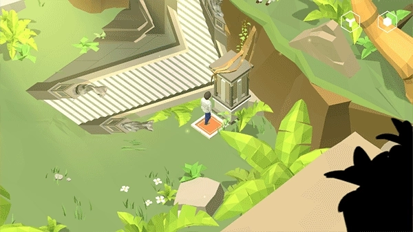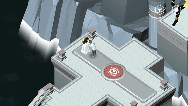 2、脚踩在眼睛图案上会升起两个物品,取走右侧的金币,将其放置到左侧的架子上;