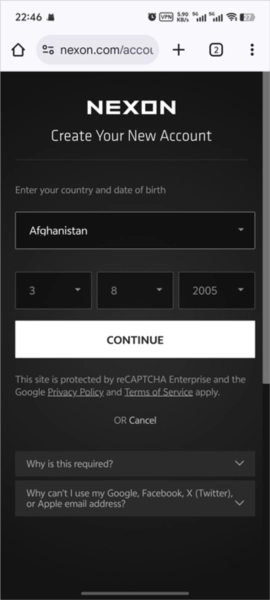 3、登录后进行注册并绑定NEXON账号,同时选择地区以及出生年月日;