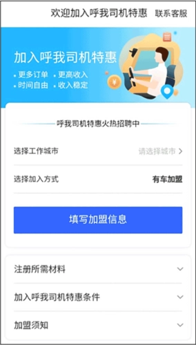2、进入招募页面后,点击“成为呼我司机”选项,接着依照页面提示的步骤完成操作,就能成功加盟。