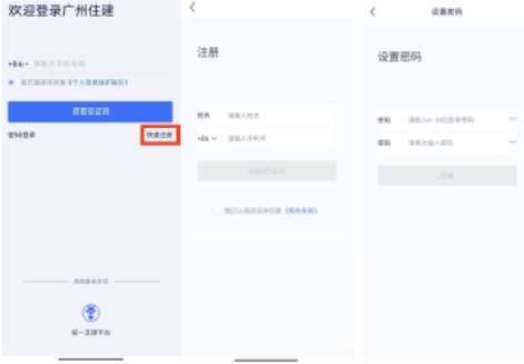 2、点击快速注册功能区域,进入注册页面,依次填写姓名、号码,输入验证码,设置账号密码,即可完成账号注册