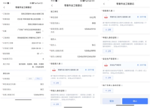4、选择零星作业工程,点击信息录入按钮,进入下一界面后点击开始填报按钮,进入零星作业工程登记页面,按要求填写工程信息,涵盖工程基础信息、建设主体信息、施工单位信息、经办人信息以及待上传的附件等内容。