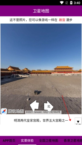 主界面下方有一个顺着道路方向延伸的箭头,点击它就能切换到相邻下一个拍摄点的街景。