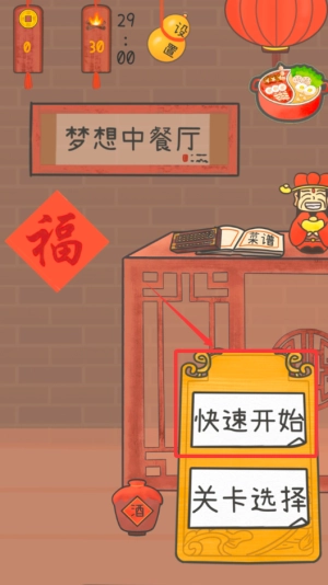 1、点击快速开始或关卡选择,进入餐厅经营模式。