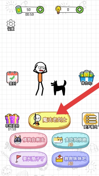 1. 页面上设有“魔法老剑士”等模式按钮,同时包含“修狗自救法”“贪吃狗快跑”等玩法。在其上方,有“签到”“体力UP”等功能选项。游戏中呈现着火柴人、黑狗等角色形象,玩家依靠画线操作来推动关卡进程。
