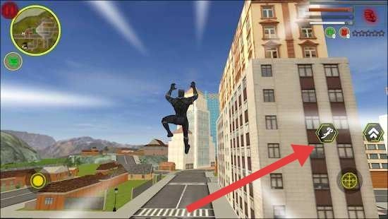 3、攀爬建筑时,点击技能按钮(箭头指向),触发跳跃/攀爬技能,在高楼间穿梭,解锁空中玩法。
