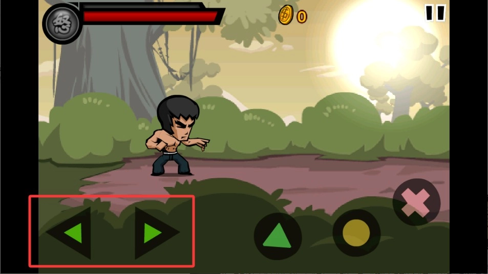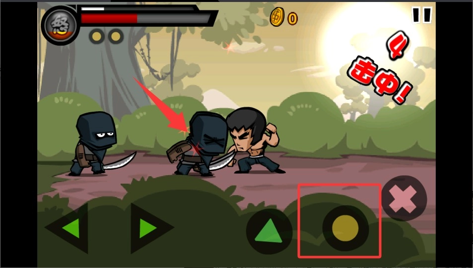 3、左手在屏幕左边上下左右划拉控制人物走位,注意躲开对手的拳头。右手随时准备点攻击键,看准机会就出手。