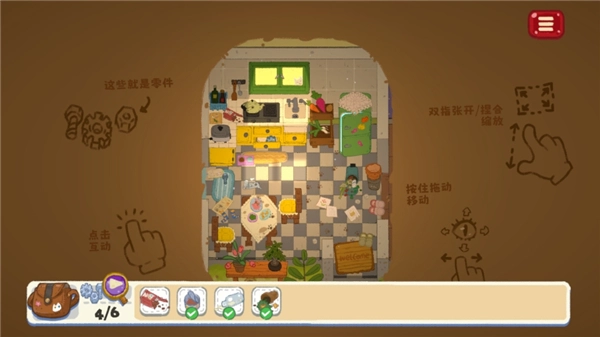1、2D手绘场景的寻物解谜玩法,每一关需要寻找3 - 6个诸如“零件”“船员用品”之类的物品,过程中要进行移开石头、打开橱柜等环境互动操作。