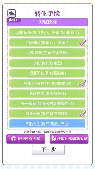 多数天赋的实际效用较为有限。就像拥有“不怕辣”天赋的角色,在剧情里依旧可能被辣到受伤;“唱歌好”的角色,也会因特定设定而遭人嫌弃。就算刷出了极为稀有的红色天赋,也无法保证剧情不会在中途意外终结,如此一来,还不如多尝试几轮普通配置,这样投入的时间或许更有价值。