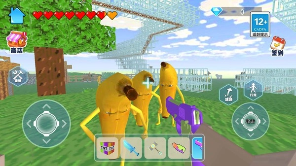在这款动作冒险类小游戏《像素世界大香蕉冒险生存》中,你能够借助TNT与各类武器,对大香蕉展开破坏并将其击败,如此便可获取游戏内的钻石奖励,进而解锁更为强大的武器。