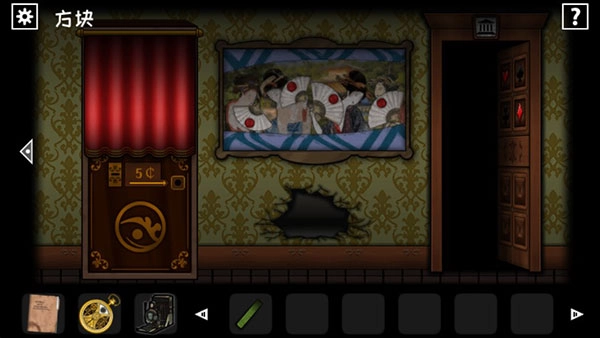 通过相机观察第五幅图,能看到挂画下方有一个红色的“X”,用锤子砸破此处后,获得了红桃以及纸片。