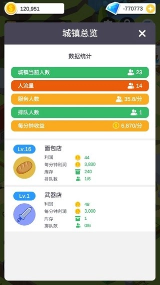 2、此外,游戏中设有城镇总览功能。借助这一功能,玩家能够深入知晓城镇内的各项具体信息,像城镇当下的人数、人流量、服务人数、排队人数、每分钟收益,以及自己经营的店铺数量与类型。