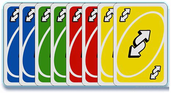 4、反转:当打出“反转”牌后,本局游戏的出牌顺序即刻反转。若原本是顺时针顺序,会变为逆时针顺序;若原本是逆时针顺序,则会变为顺时针顺序。例如,假设有A、B、C、D四位玩家,正常出牌顺序为A→B→C→D ,在打出该牌后,出牌顺序就变成D→C→B→A 。