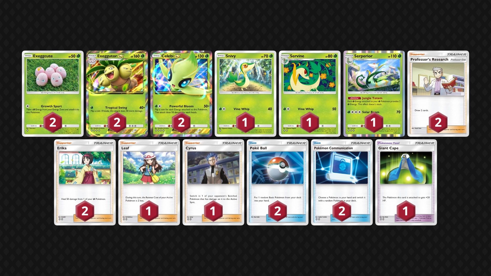 这套卡组的思路和时拉比椰蛋树ex卡组截然不同,它主要依靠培养时拉比ex来赢得比赛,椰蛋树ex仅作为过渡。然而,鉴于大家普遍认为椰蛋树ex应该满编,玩家或许会慢慢舍弃君主蛇,转而选择椰蛋树ex卡组。不过,在草系内战里,这套构筑存在一定优势(前提是不被对手运气碾压)。这套卡组跟前一套类似,只是增添了斗篷和赤日。赤日很好地解决了椰蛋树ex磨血却未将对方打死的尴尬局面。