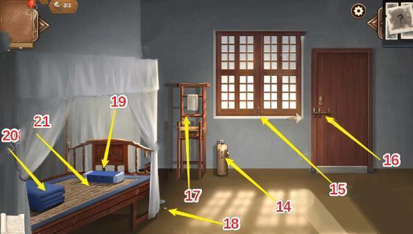 2、房间钥匙、尸体手指、点心、麻绳、热水壶、黄铜插销、完好无损的门锁、剃刀、打火机、枕头、铺得平整的床铺、崭新的草席。