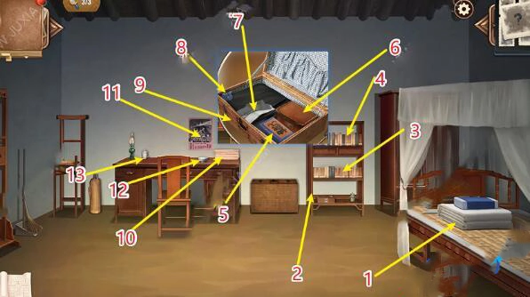 1、房间内物品如下:床铺摆放得十分整齐,还有一个较为简陋的书架。书架上放着《南华县志》《明史纪事本末》《民俗学集销》等书籍。此外,房间里有一个小药箱,一些换洗衣物,几颗黑色药丸,一只藤箱,一叠作业本,几张电影海报,一个空碗以及一个白瓷茶杯。