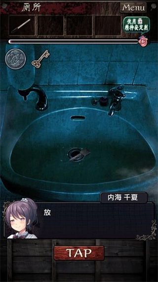 3、来到厕所,调查洗脸台,然后把里面的水给放了,获得钥匙,顺便把隔间里的木板调查一下。