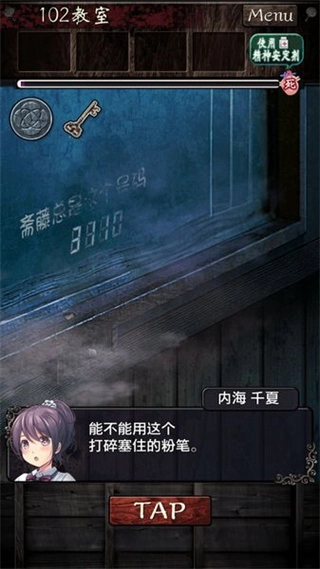 6、点击教室的黑板位置,可以看到黑板上有秘之涂鸦,但是主角表示看不清数字,所以先不管它,用圆珠笔打碎下面抽屉里面卡住的粉笔,打开抽屉,获得钥匙。