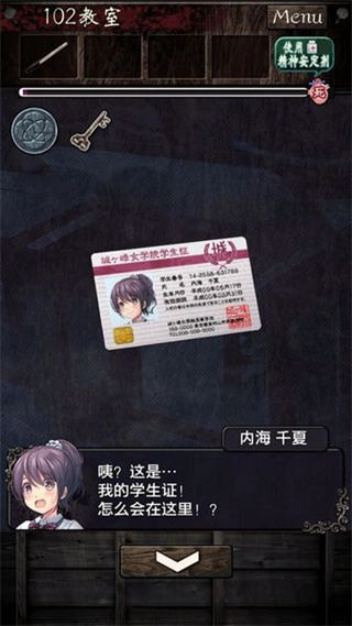 5、进入教室后,点击画面右中间,可以看到一个桌子,打开其中的抽屉可以获得一张学生证,学生证只有二周目的时候才能看到,没有也很正常。