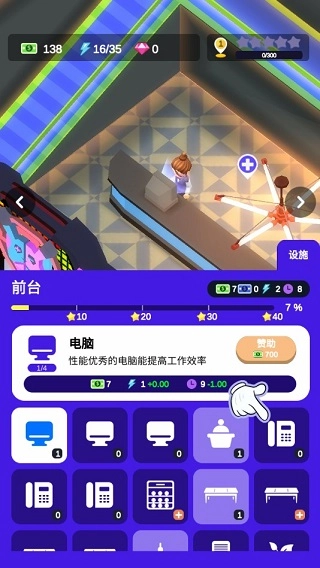 首先,我们需要对酒吧的前台购买电脑,没有电脑,员工就无法上班。具体的操作,点击酒吧前台区域,如图: