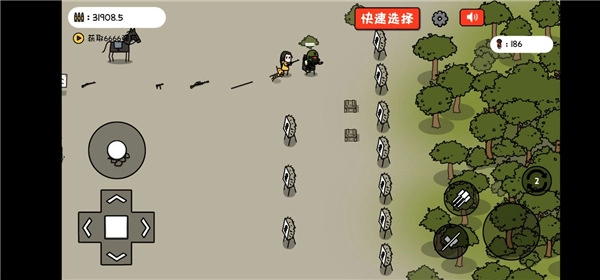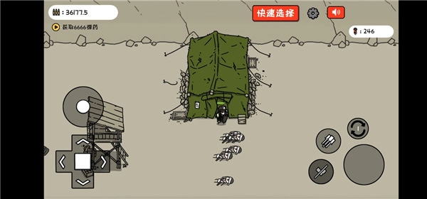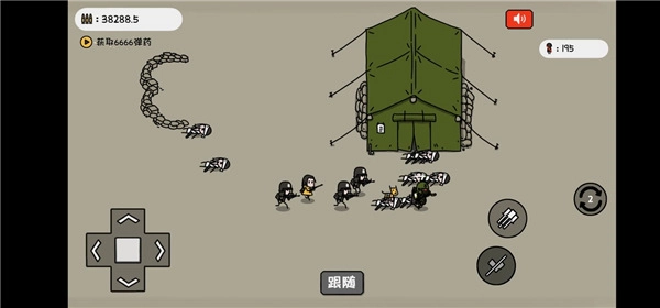 5、左边的就是角色的移动方向键,用来控制小士兵移动的方向,右边就是角色的功能键了,有一个方向指向的图标就是用来翻跟头的,通过翻跟头来躲避敌人射出的子弹;小石子图标就是投掷小石子,这个是没有限制,无限补充;右边显示数字的图标就是用来切换武器,目前的武器搭配就是步枪和大刀;中间最大的子弹图标就是用来开枪的功能。