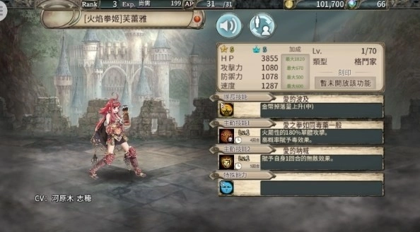 评点:拥有相当不错的全体伤害(150%),并且可以提高全队的攻击力,适合给主C上状态来增加队伍输出。队长技增加金币掉落(作用不大)