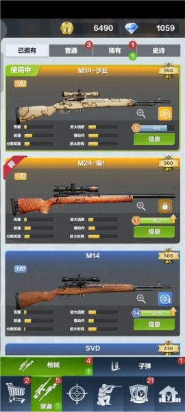 该界面分为枪械与子弹两个部分,在此不仅能查看枪械、子弹的详细信息以及获取条件,后续的保养与升级操作也都在此进行。