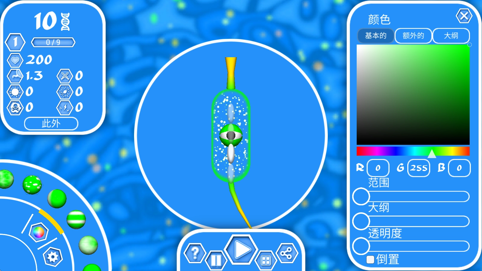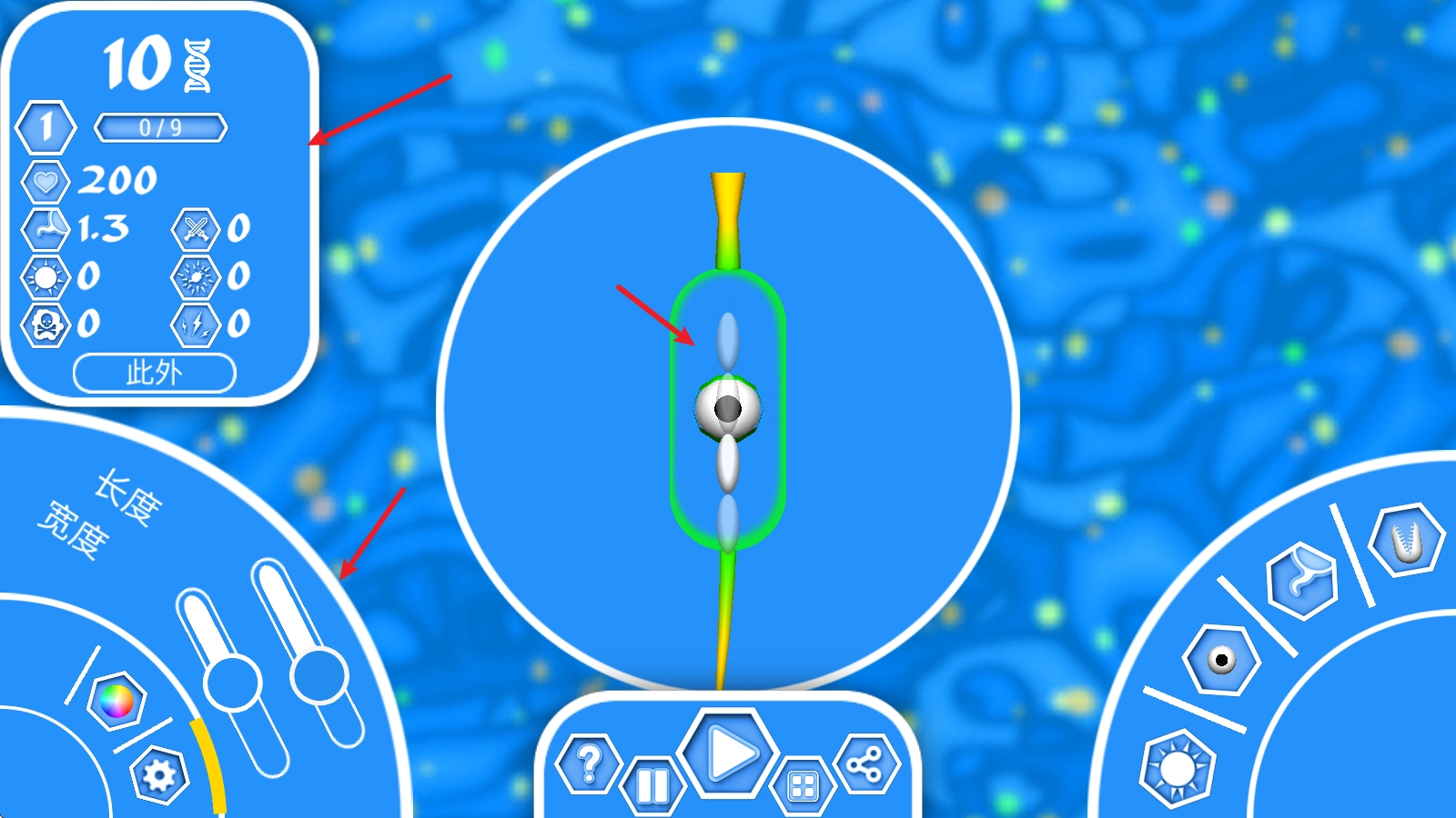 4、接下来便能够着手培养你的孢子了,在左上角能够查看孢子的参数,点击孢子会出现轮盘,通过轮盘可对孢子的长度与宽度进行调整。