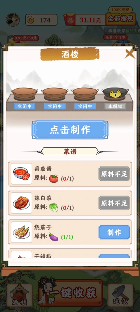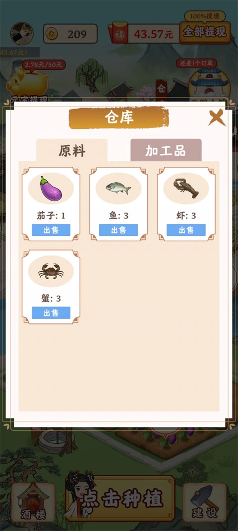 这款游戏玩法极其简单,仅需一键完成种植、养殖、收获等操作,就能迅速完成订单,赢取现金红包。当然,除了种植与养殖,玩家还能通过完成小船订单、打理酒楼生意、获取角色赠送的礼物等方式赚取现金红包,甚至还有离线收益静候领取。