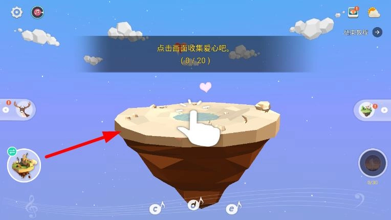 1. 进入游戏后,抵达初始岛屿,点击屏幕的任意地方收集爱心,熟悉收集节奏以及基础操作,为后续的装饰积攒资源。