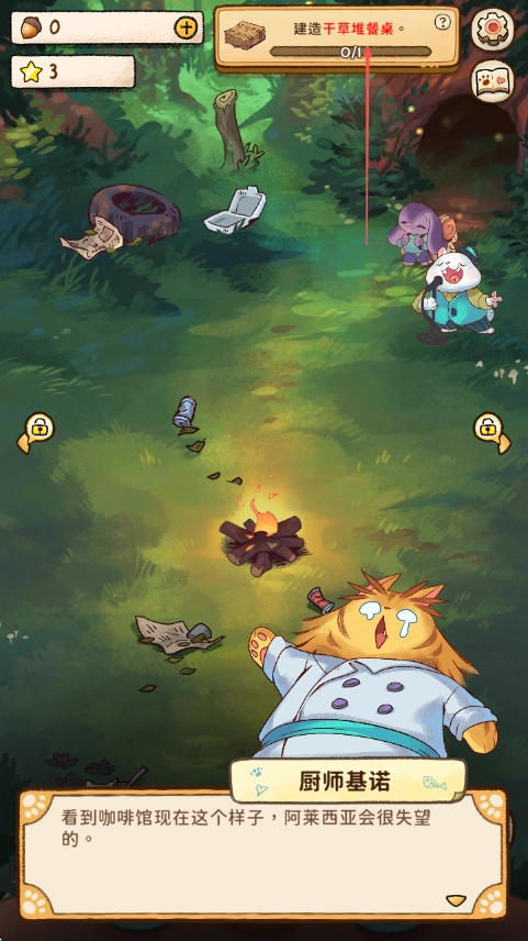 1. 开启游戏后,留意屏幕上方的提示,确认建造干草堆餐桌这一任务,此刻坚果资源处于0的状态。