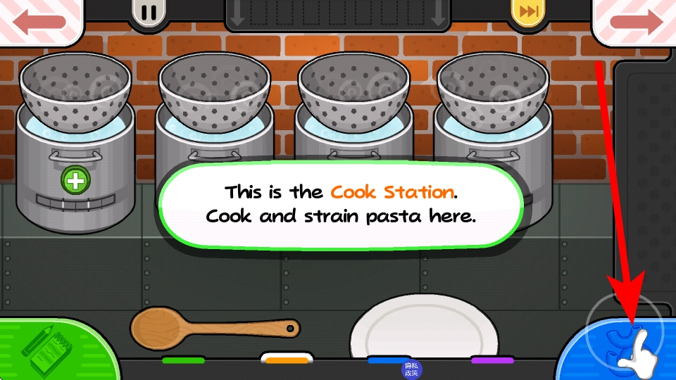 4、待意大利面制作完毕,点击绿色的完成按钮,随后将盛有意大利面的盘子送至面包站,至此整个制作与传递流程结束,顾客便可尽快品尝到美食。