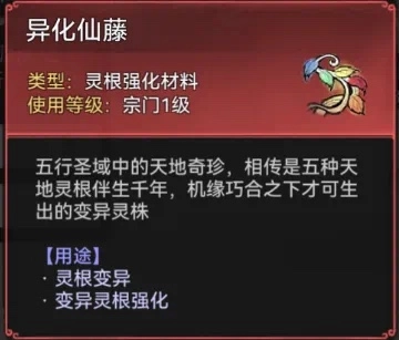 异化仙藤:讨伐异兽或于宝地采集时有一定概率获取,可用于弟子灵根的变异与强化,显著增强战斗能力。