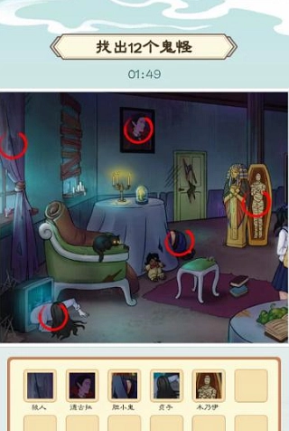 1、首先能看到,这里有12个鬼怪需要玩家去寻找。不少鬼怪隐藏得极为巧妙,以至于有些玩家无法找出它们的位置。
