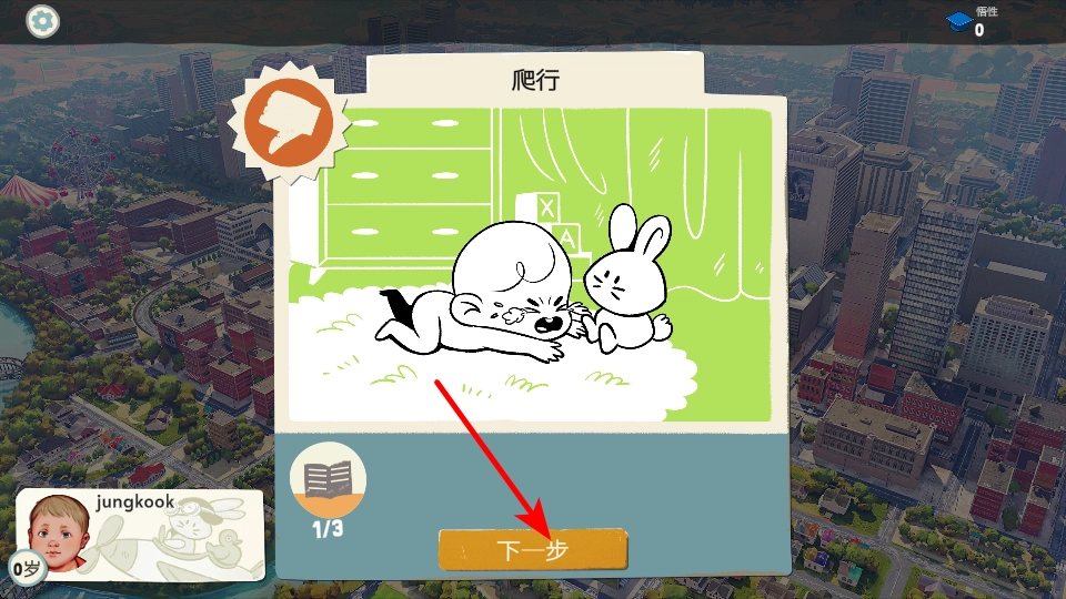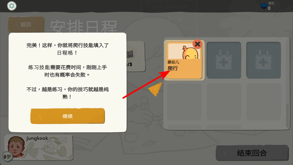1. 在技能安排界面,把爬行技能填入日程格,接着点击“继续”按键,就能确认技能安排,进而进入后续的技能练习环节,开启成长之路。