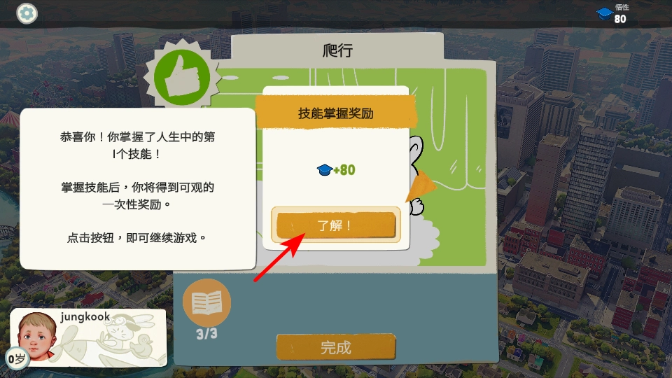 3、成功掌握技能后,点击“了解”按键,领取技能掌握奖励,像悟性值等。这些奖励能够用于学习新技能,助力角色持续成长。