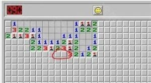 5、红圈所指的“1”处已确定有一颗雷。此时,只需将鼠标置于“1”上,按住右键不松开,接着点击一下左键,“1”周边的其他方块便会全部被点开。这个小技巧对提高游戏速度很有帮助。