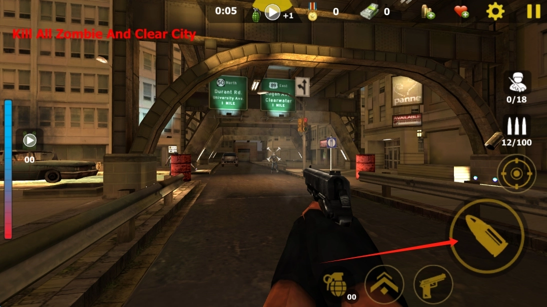 3、在关卡界面中,操控角色进行移动与射击。当弹药不足时,需及时点击弹药图标补充弹药,以完成僵尸的清理工作。在整个过程中,要适时点击进行射击敌人的操作。