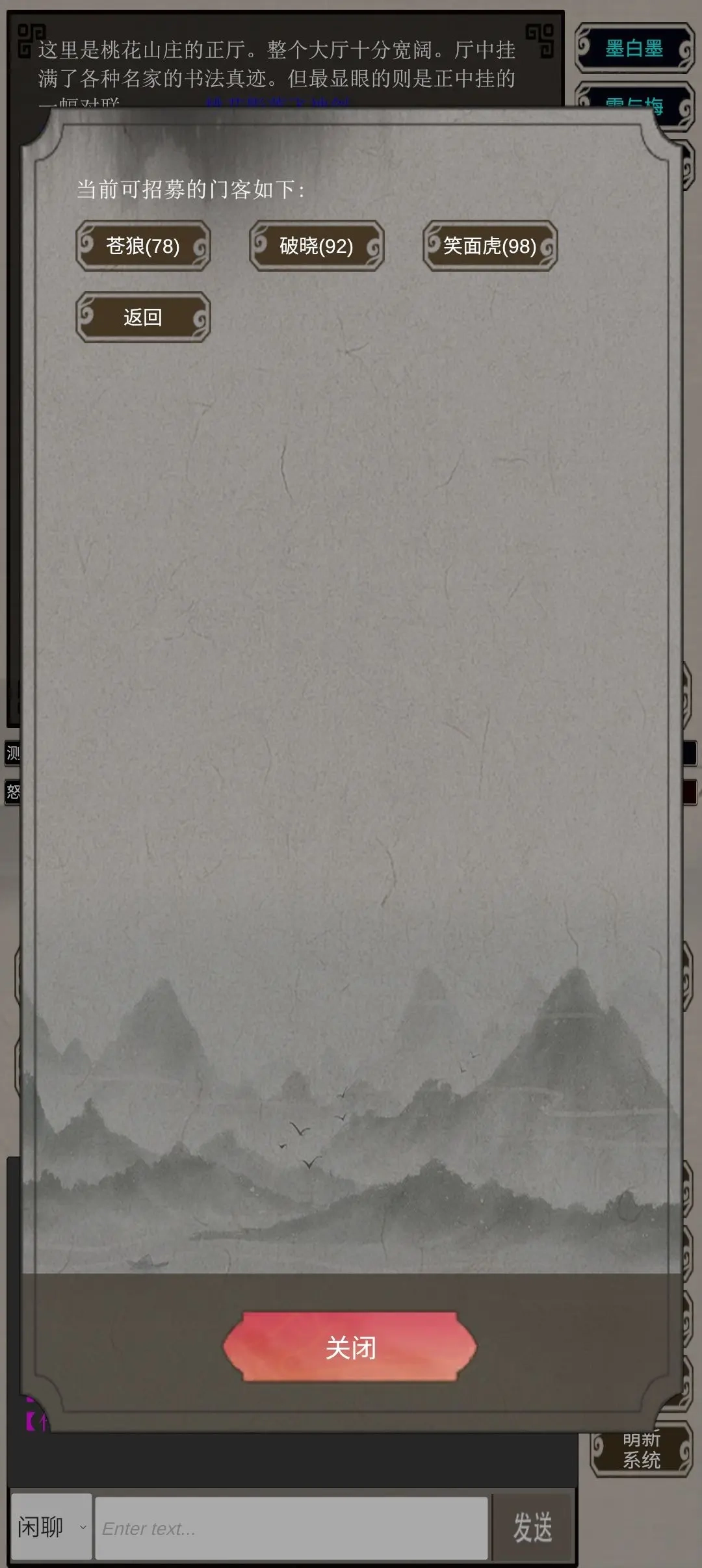 拜师完成后,我们可以花费其中100元宝,在任务相关板块的门客系统里招募门客。挑选时建议选择括号内数字较大的。门客能协助你战斗,还能自动完成师门任务。操作时先点击召唤,再点击执行师门任务即可。