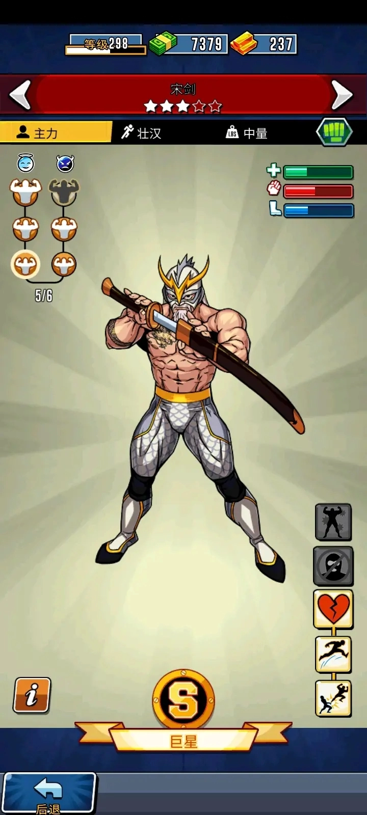 "宋剑"(善),不错的输出,升到5星,加满“连续击打”技能就适合投入使用了,推图常用,特殊事件刷排名也经常用。